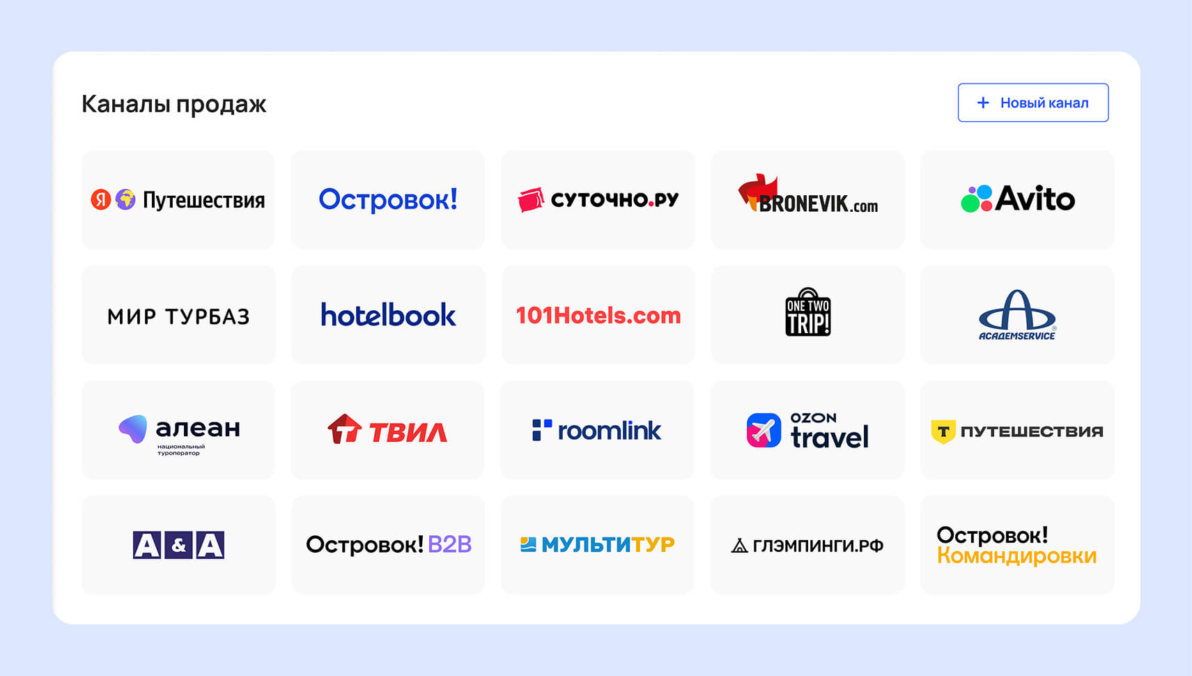 Система поддерживает 65+ каналов бронирования, включая крупные OTA и региональные площадки. После подключения отель управляет ими из одной вкладки, менеджеру не нужно заходить в личный кабинет каждого агрегатора.