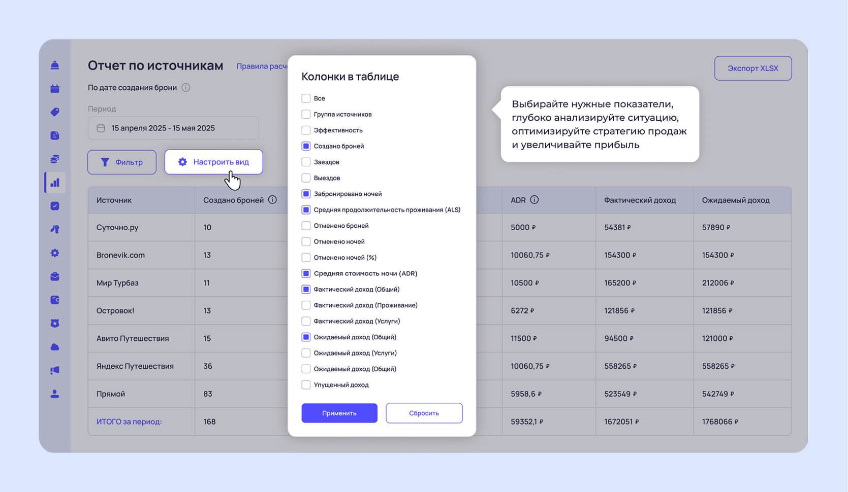 Эти данные помогут определить, какие площадки приносят наибольший доход, а где результаты не соответствуют ожиданиям. На основе аналитики отель принимает точечные решения: усилить присутствие на прибыльном канале, скорректировать тарифы или изменить позиционирование на этих площадках.