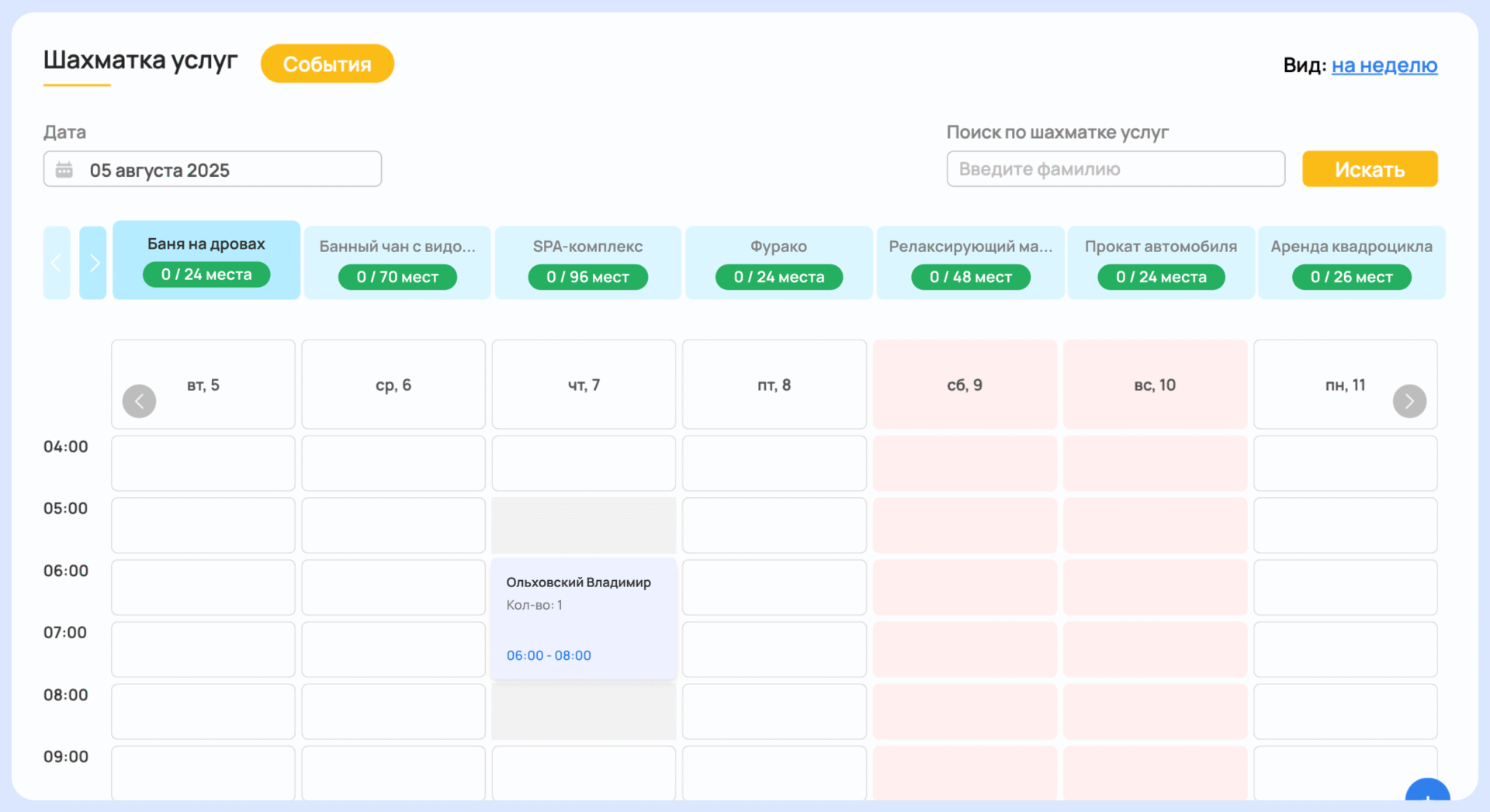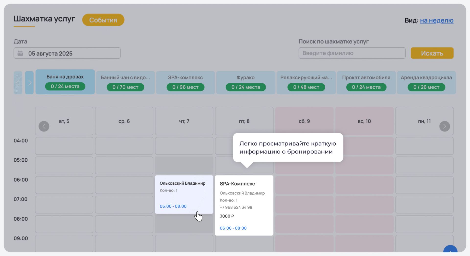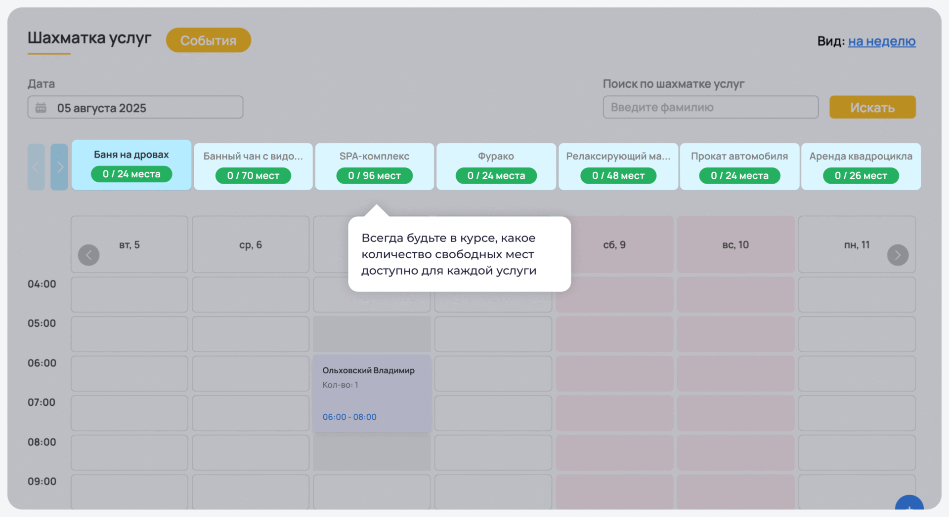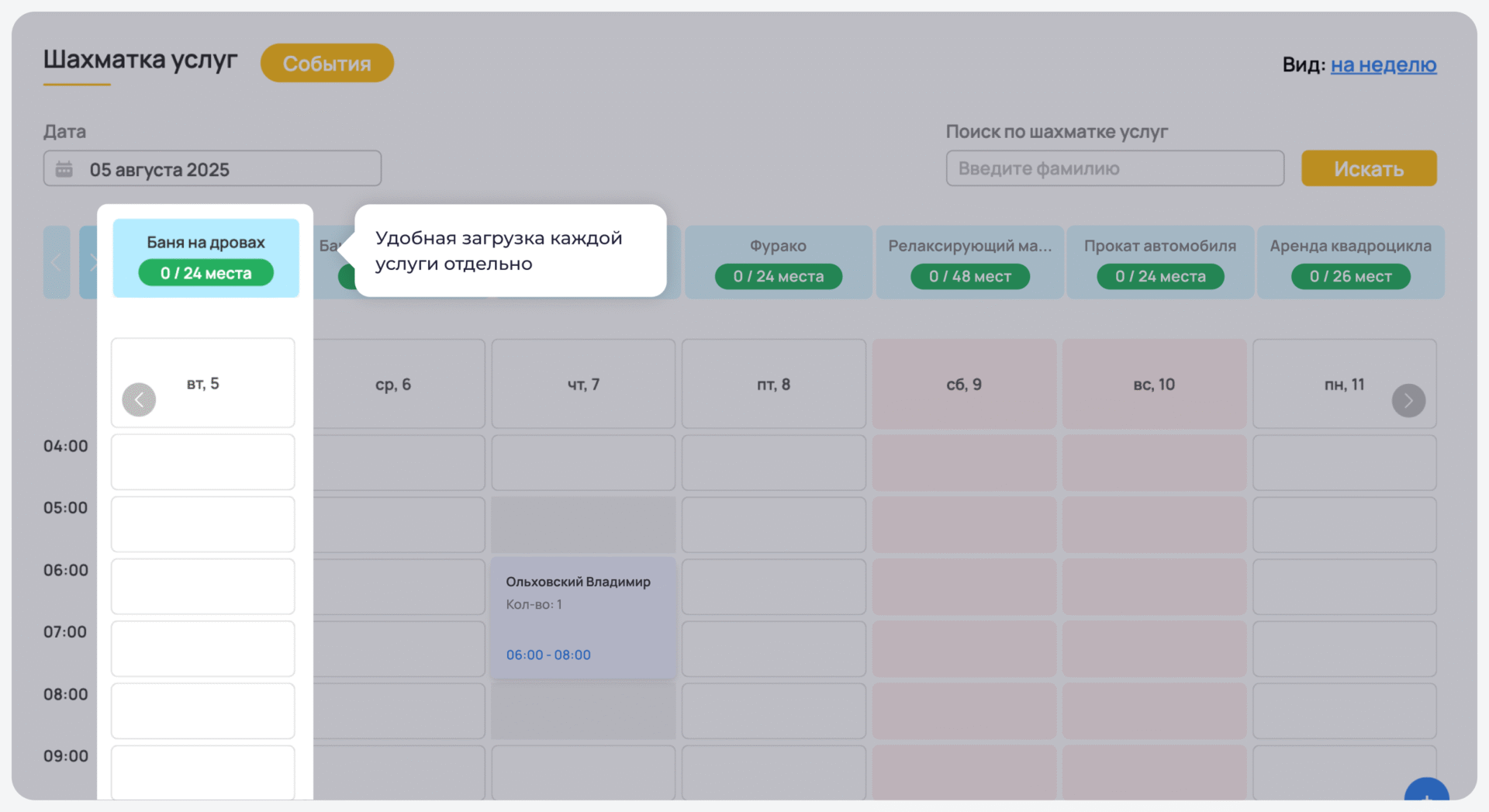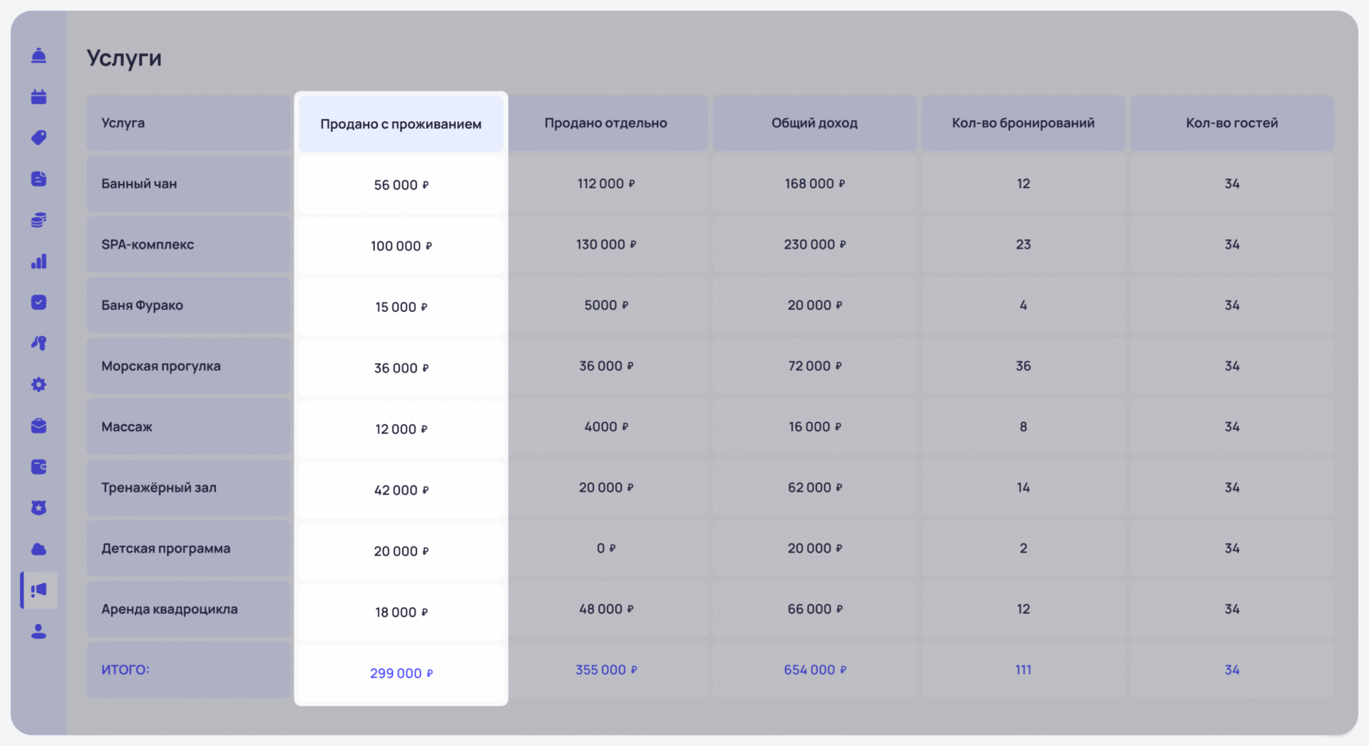 Инструмент помогает точно отследить загрузку каждой дополнительной услуги — будь то спа, баня, прокат оборудования или аренда зала для мероприятий. Информация по каждой услуге отображается в реальном времени, чтобы сотрудники отеля следили за спросом и избегали накладок в расписании.