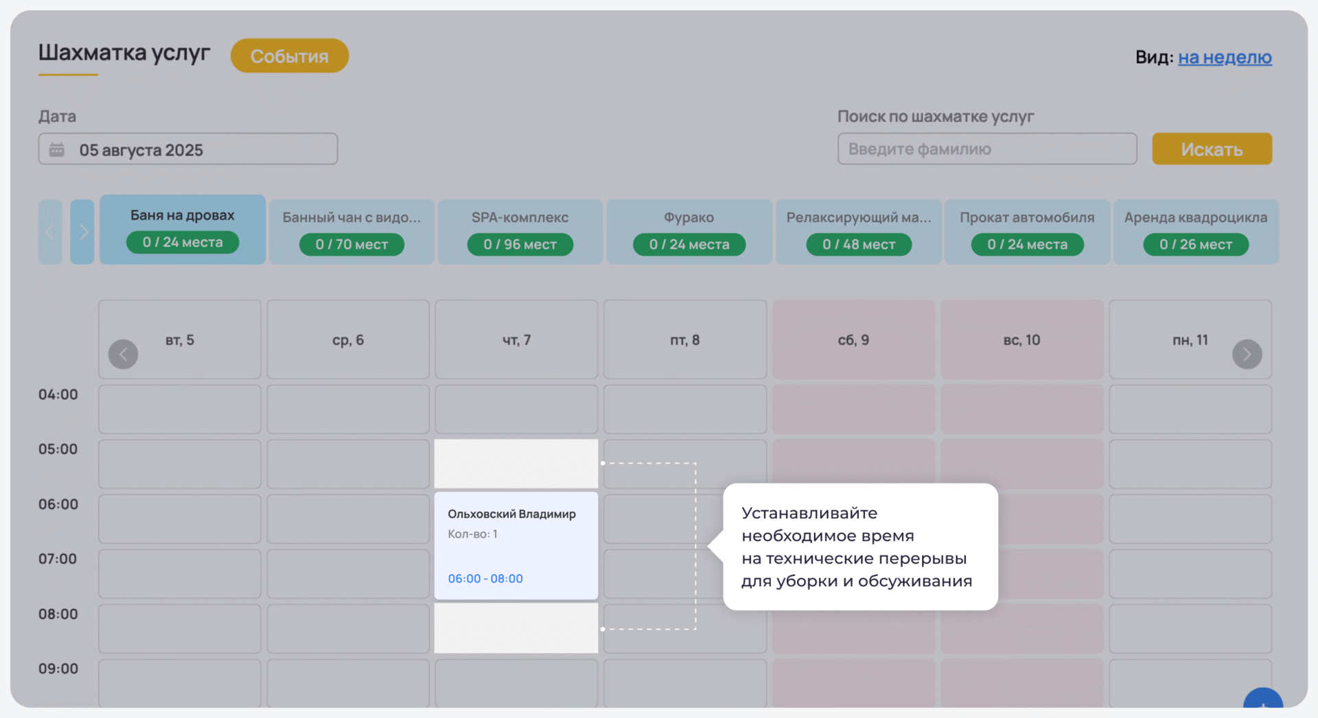 • Возможность настроить технические перерывы. Например, если вам нужен час на уборку спа-помещения.
