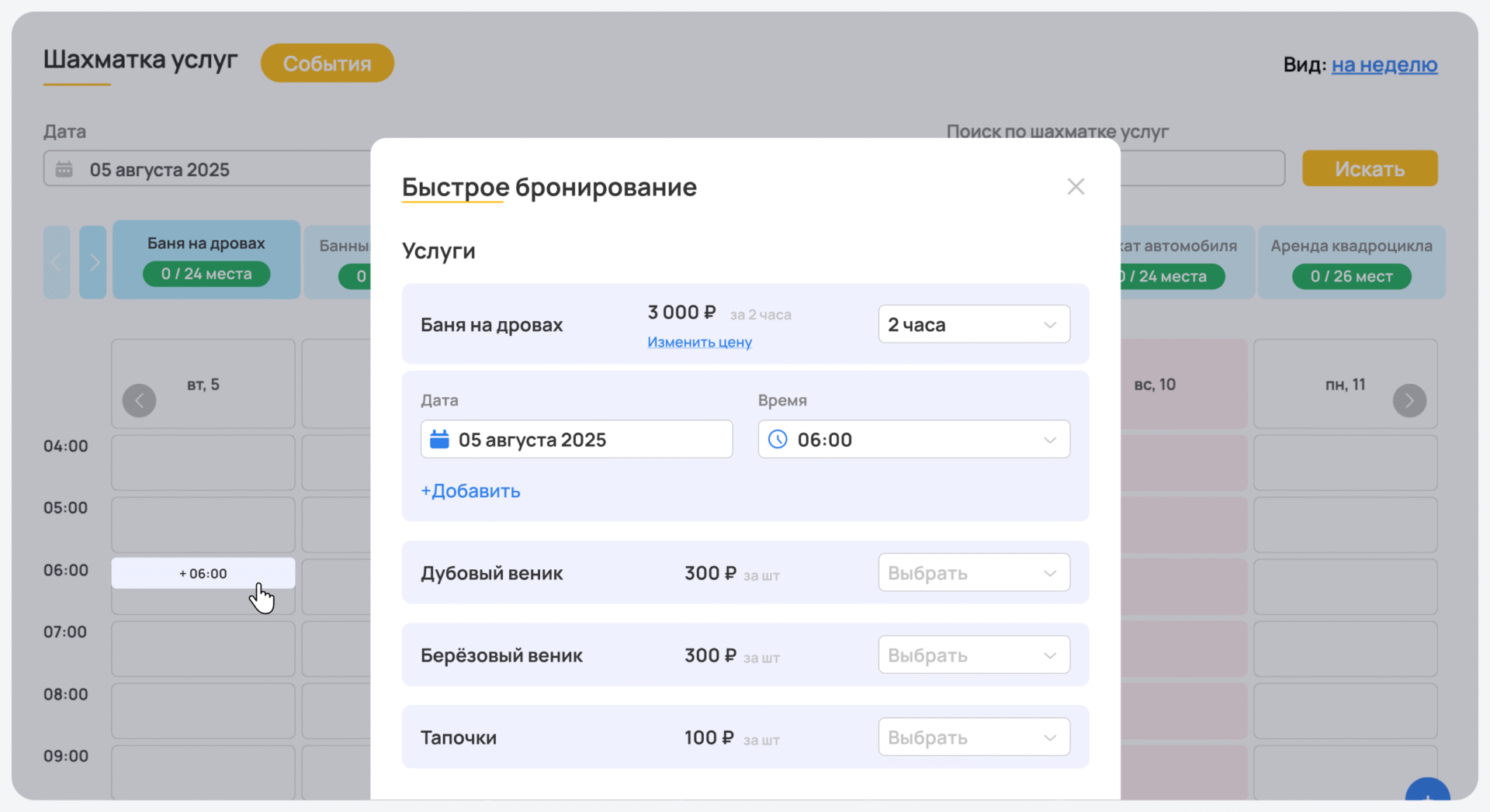 Все эти товары можно добавить к почасовым услугам и услугам с фиксированной оплатой. При бронировании номера гость видит все доступные позиции и может положить их в свою корзину.