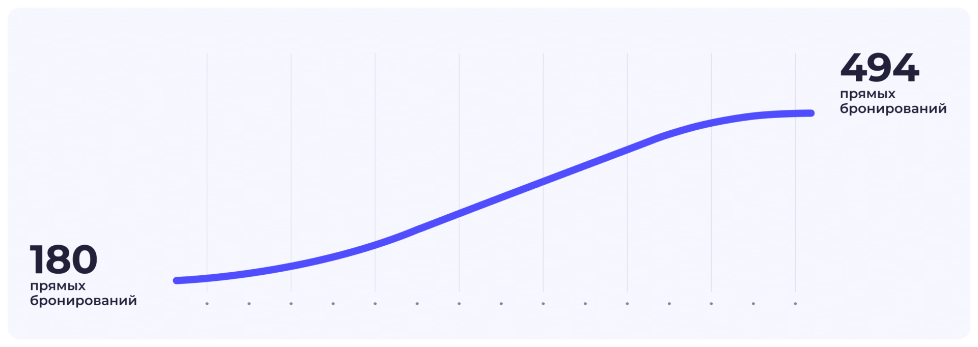 Через восемь месяцев после подключения PMS-системы отель зафиксировал 494 прямых брони против 180 за аналогичный период прошлого года. Сегодня около 70% продаж поступает напрямую, а доля продаж с OTA снизилась до 25-30%.