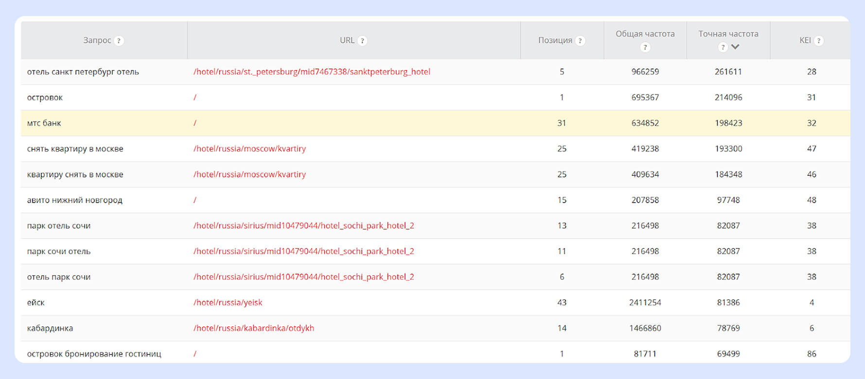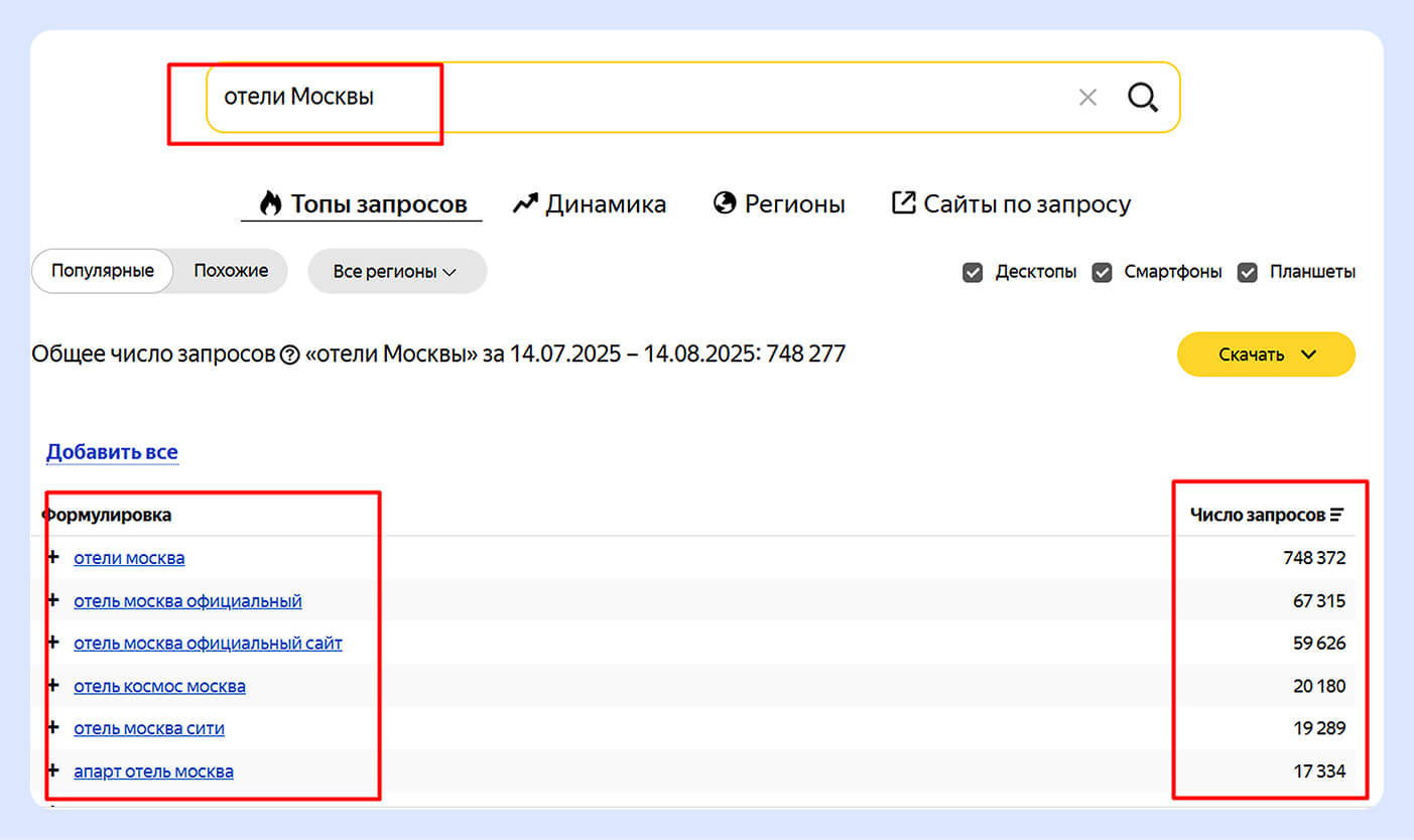 «Яндекс Вордстат». С его помощью фиксируем все варианты запросов, по которым потенциальные гости ищут отели в вашей локации. Например, «отель в Сочи с бассейном» или «бюджетный отель в Москве рядом с метро». «Вордстат» показывает, сколько людей ищут эти варианты и насколько они популярны в разные сезоны.