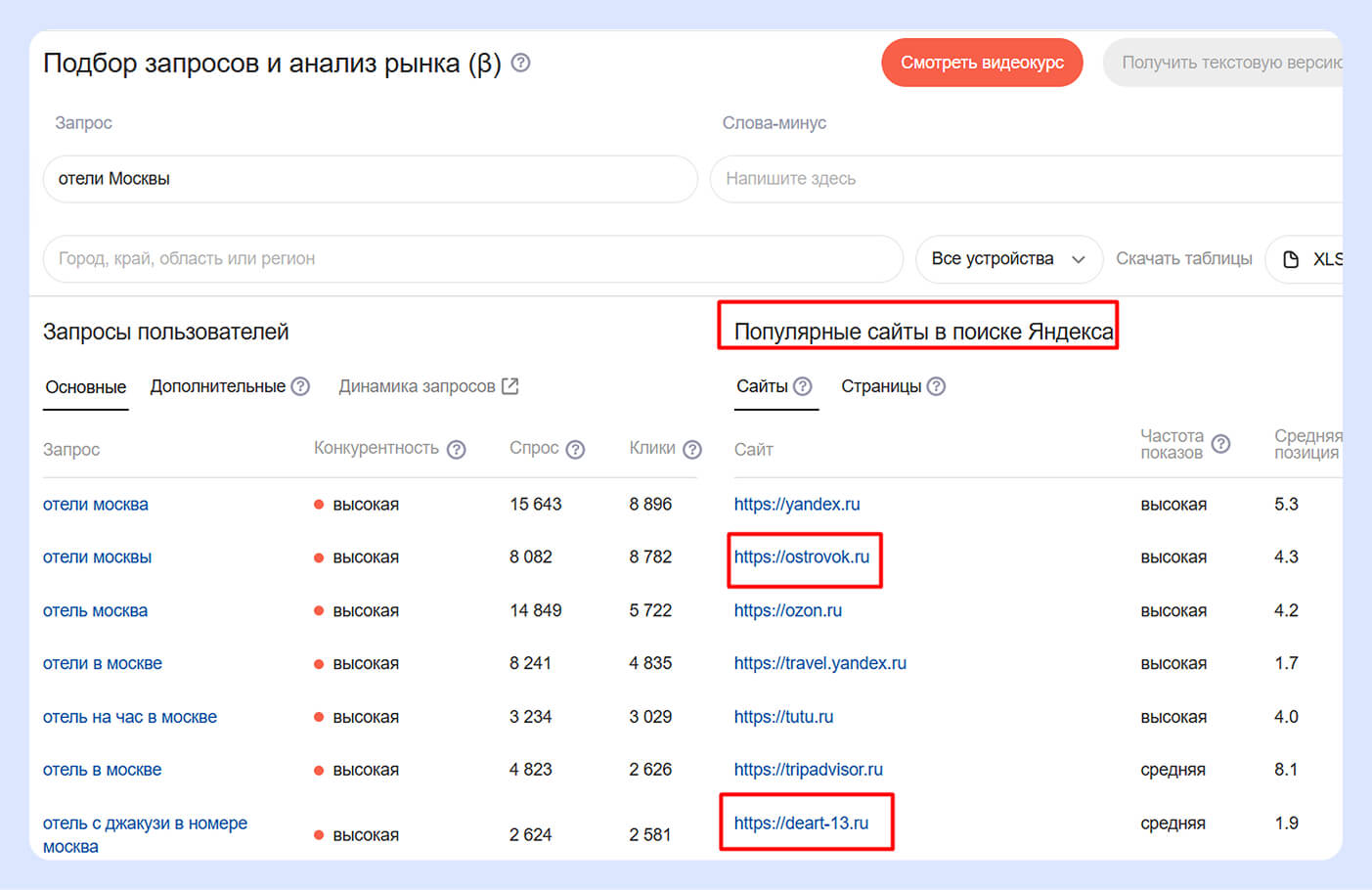 Анализ конкурентов через «Яндекс Вебмастер». Выбираем успешные сайты-конкуренты и проверяем, по каким запросам они получают трафик. Это помогает увидеть, какие страницы и услуги работают у других отелей и какие возможности вы еще можете использовать.