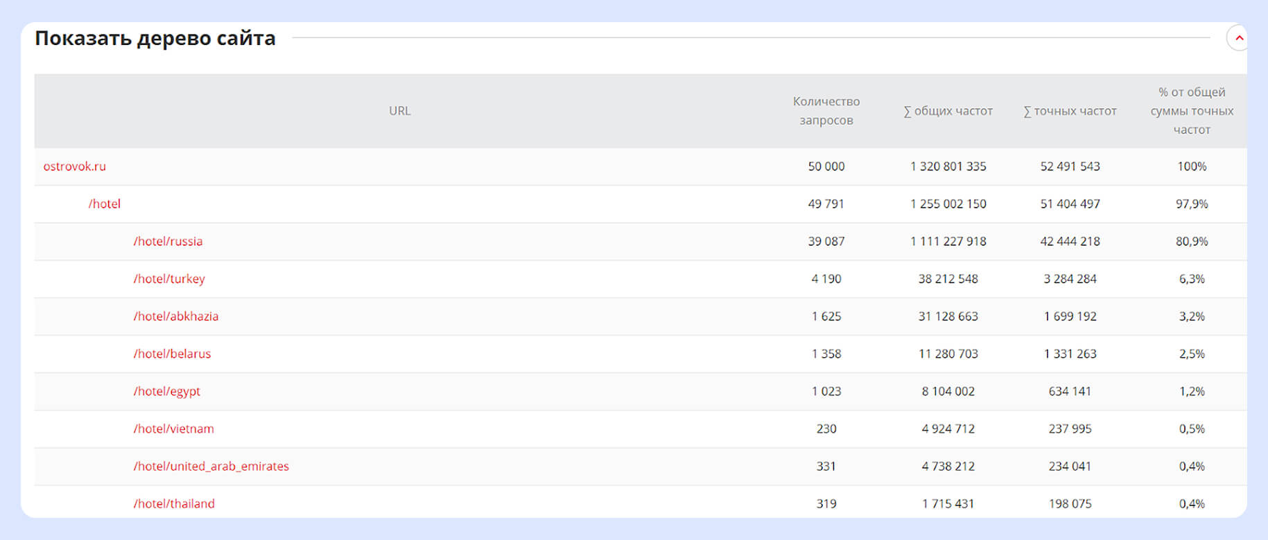 «Пиксель Тулс» позволяет увидеть структуру сайта конкурента и понять, какие страницы приносят ему больше всего трафика. Достаточно вставить ссылку на сайт конкурента — сервис покажет, по каким ключевым словам каждая страница находится в топ-10 и какой процент трафика она получает. Далее требуется создать аналогичные страницы у себя на сайте, адаптировав адреса страниц под логику вашего сайта.