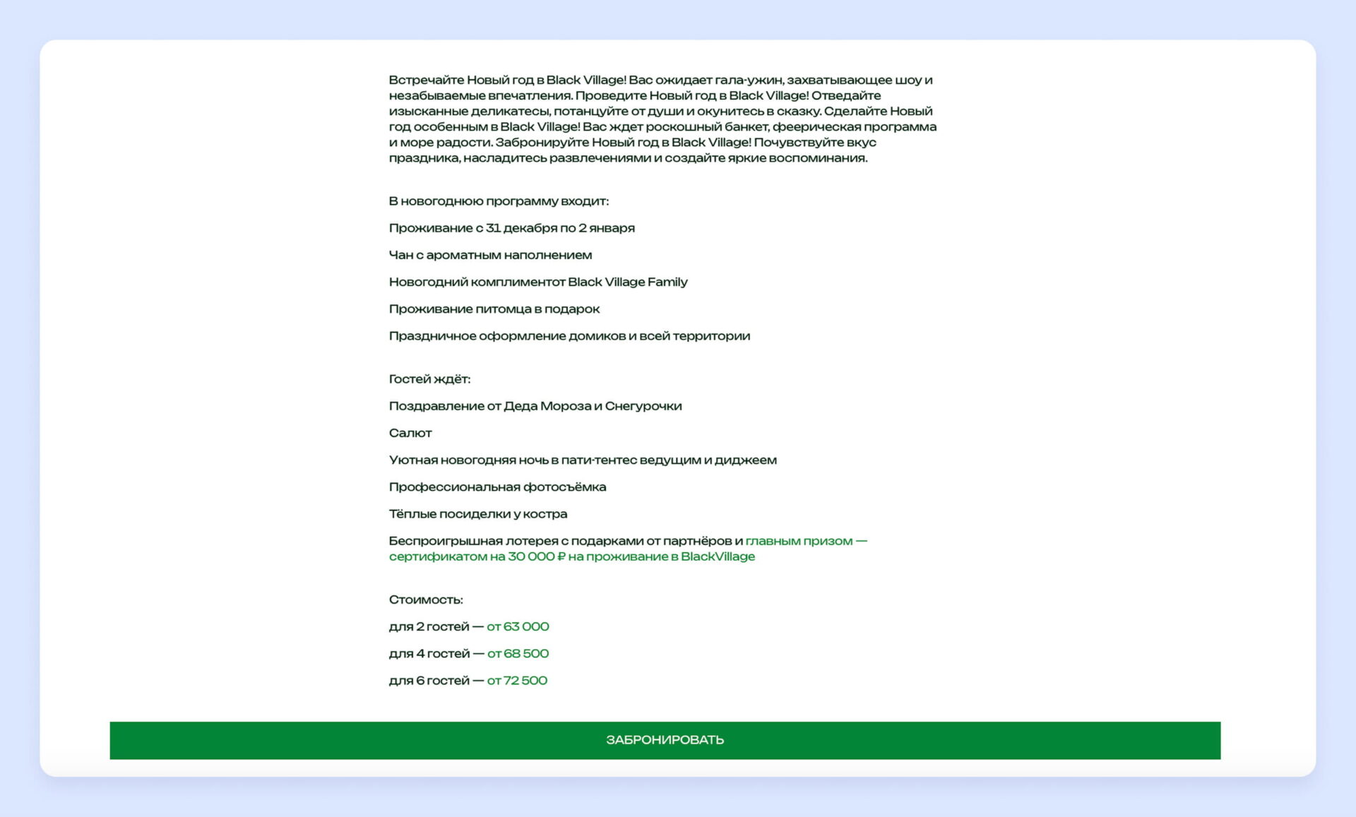 Пример спецпредложения с кнопкой, ведущей к бронированию