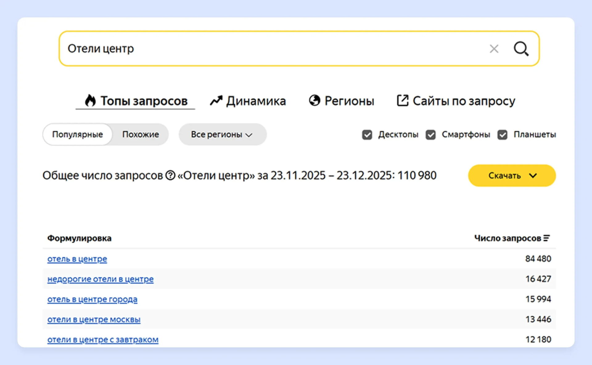 Данные из сервиса «Вордстат» по запросу «отели центр»