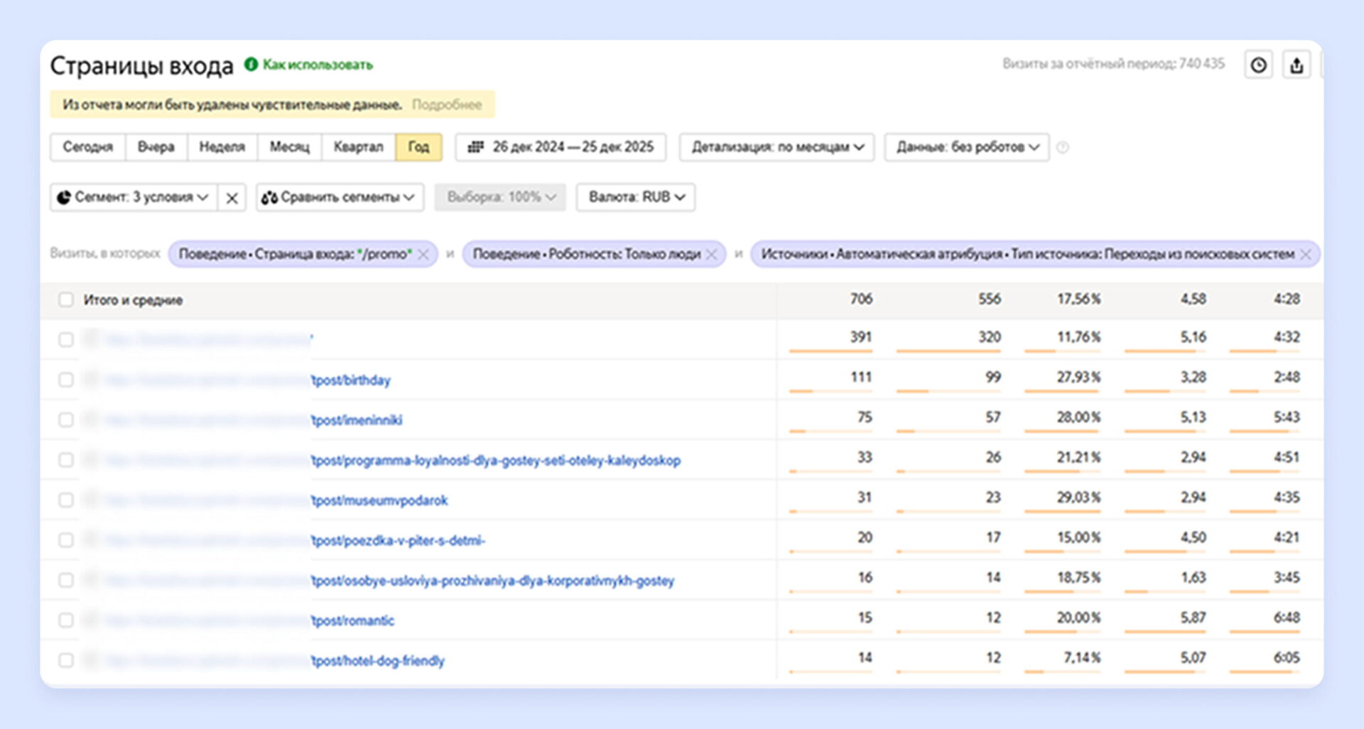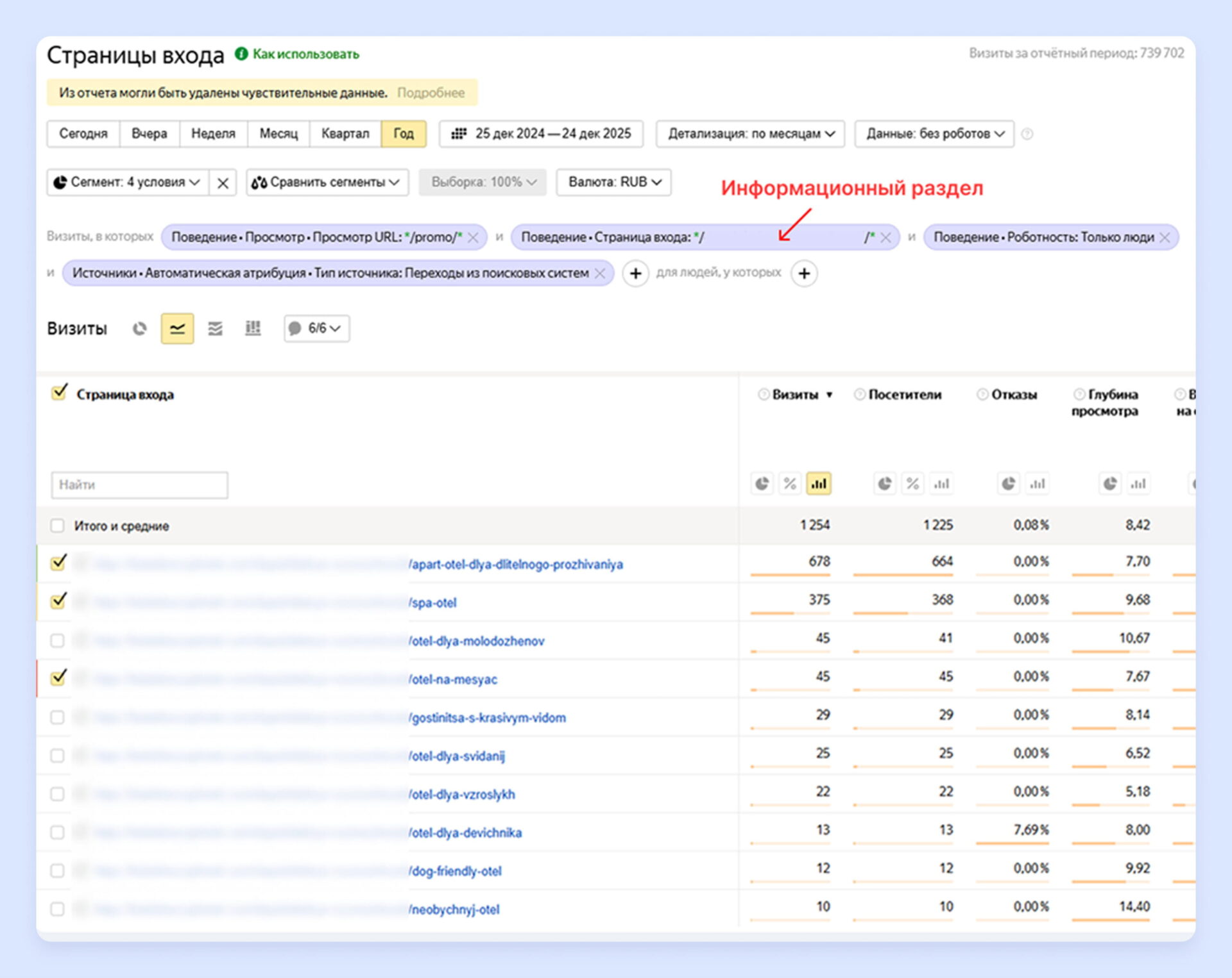 Первый базовый показатель — это количество визитов на страницы акций из органического поиска. Его легко отслеживать в системах аналитики вроде «Яндекс Метрики». Уже на этом этапе видно, какие предложения привлекают внимание гостей, а какие остаются незамеченными.Но сами по себе визиты мало что значат. Гораздо важнее смотреть, как гости ведут себя на странице: читают ли условия, пролистывают ли страницу, переходят ли к бронированию. Эти данные помогают понять, работают ли заголовки, офферы и визуалы, или страница теряет внимание ещё до ключевого действия.