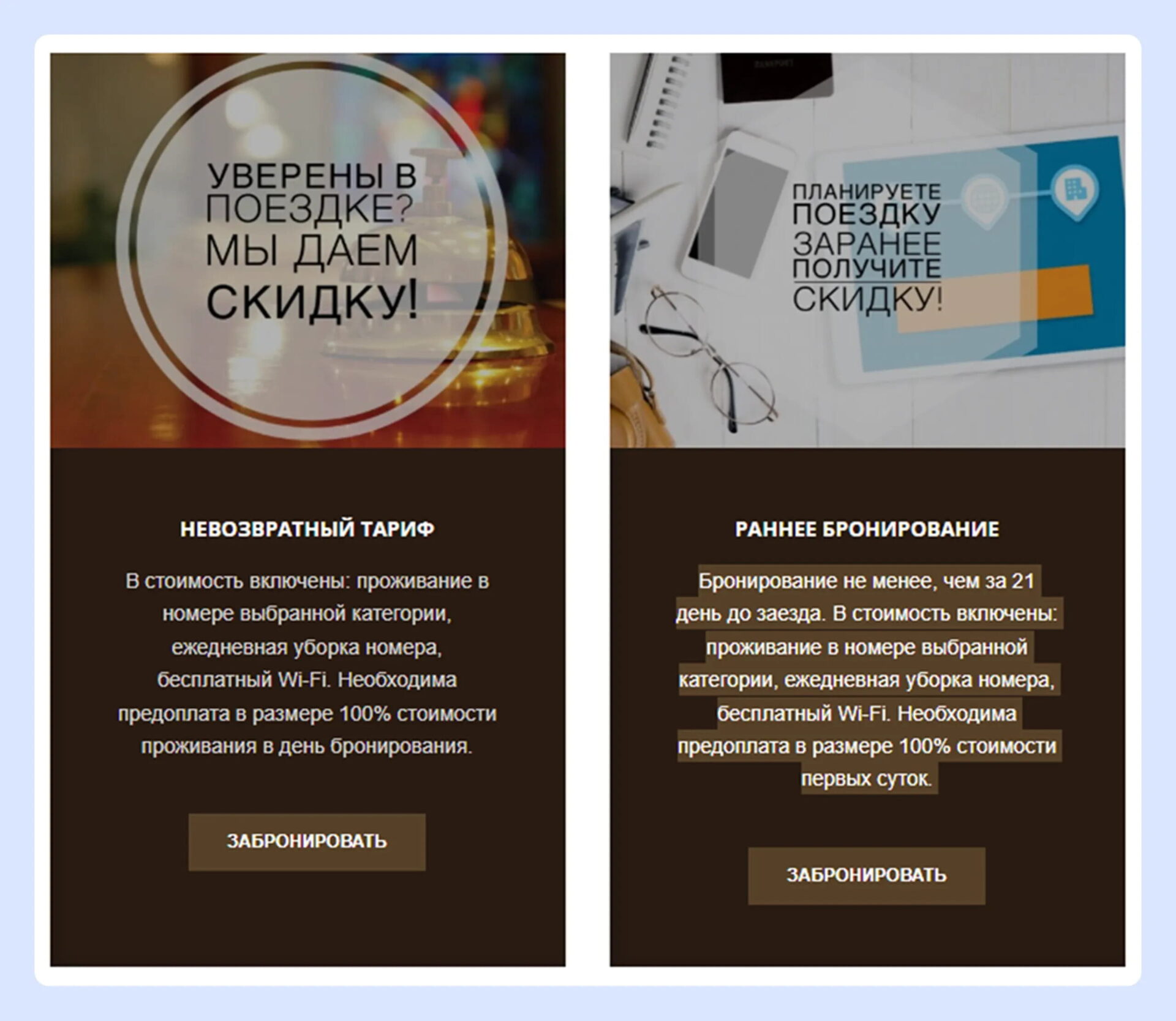 Часто тексты акций пишутся формально — «для галочки». Без четких сроков, конкретных выгод и понятных условий. Когда гость не понимает, что именно входит в предложение, почему это выгодно и до какого момента действует акция, он не воспринимает ее как ценное предложение. Это приводит к низкой вовлеченности, быстрому уходу со страницы и отсутствию бронирований.