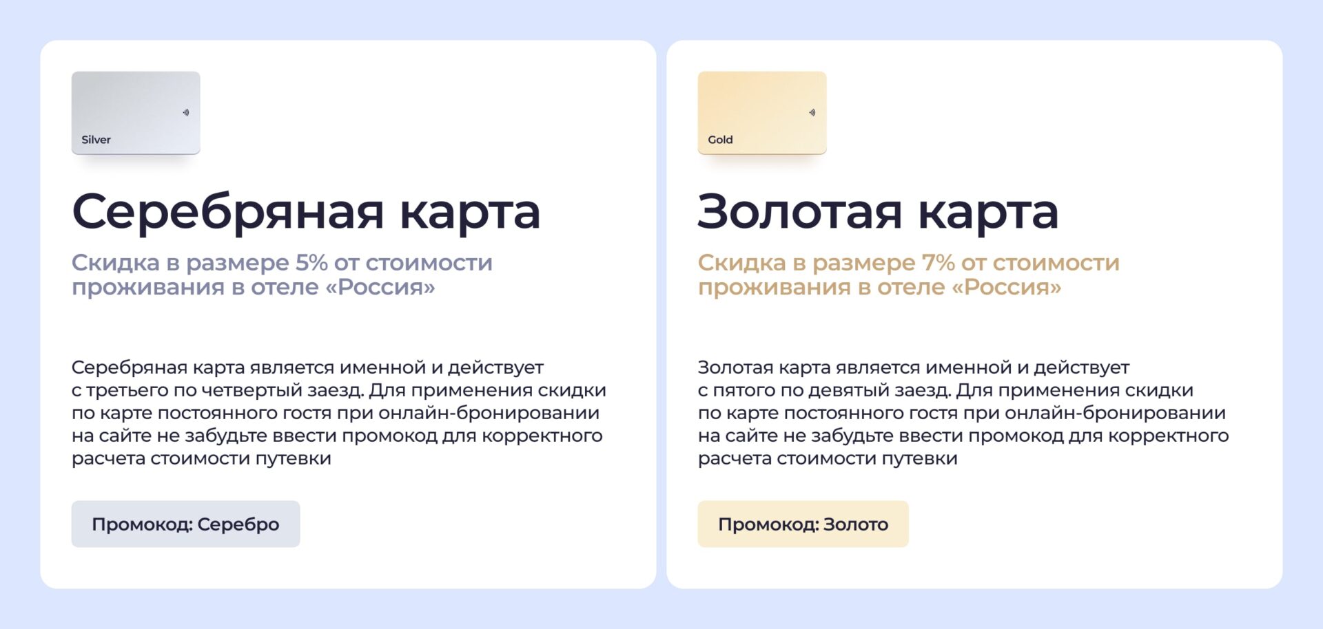 Другой пример — отель Rimar в Краснодаре. Здесь размер скидки зависит не от количества визитов, а от общей суммы, которую гость потратил в отеле. После того как на счете гостя накапливается 200 тысяч рублей, ему предоставляется скидка 5%. При достижении 300 тысяч рублей скидка увеличивается до 10%, а при суммарных расходах 400 тысяч рублей — до 15%.