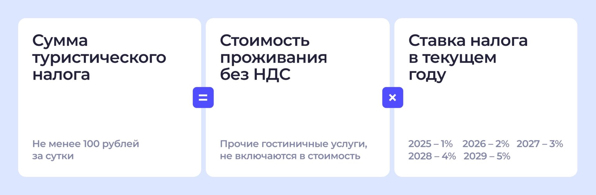 Ставка налога будет увеличиваться в течение нескольких лет. В 2025 году она составит 1% от стоимости проживания, но не менее 100 рублей за сутки. В дальнейшем налоговая ставка будет увеличиваться: в 2026 году до 2%, в 2027 году до 3%, в 2028 году до 4% и в 2029 году до 5%. Сумма налога будет зависеть от ставки в регионе.