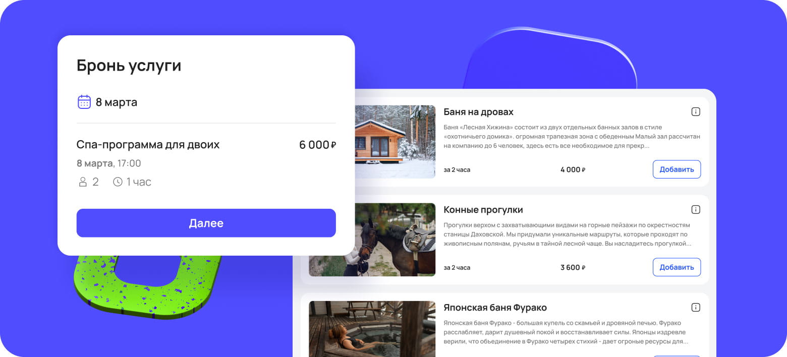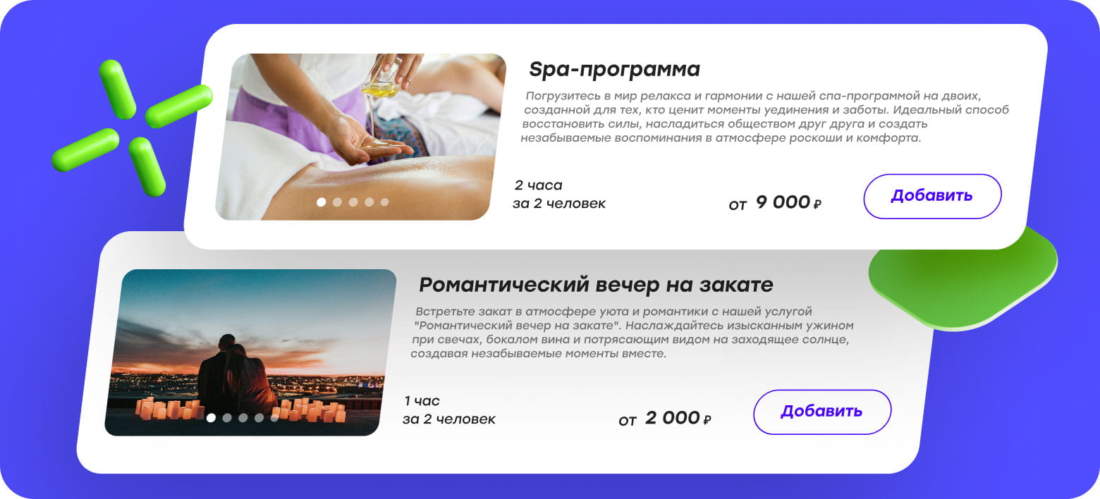 Гостям важно видеть предложения заранее — еще на этапе выбора отеля. Интеграция с модулем продажи дополнительных услуг от «Бронируй Онлайн» позволяет включить такие услуги в пакетные предложения, делая их неотъемлемой частью сценария отдыха.