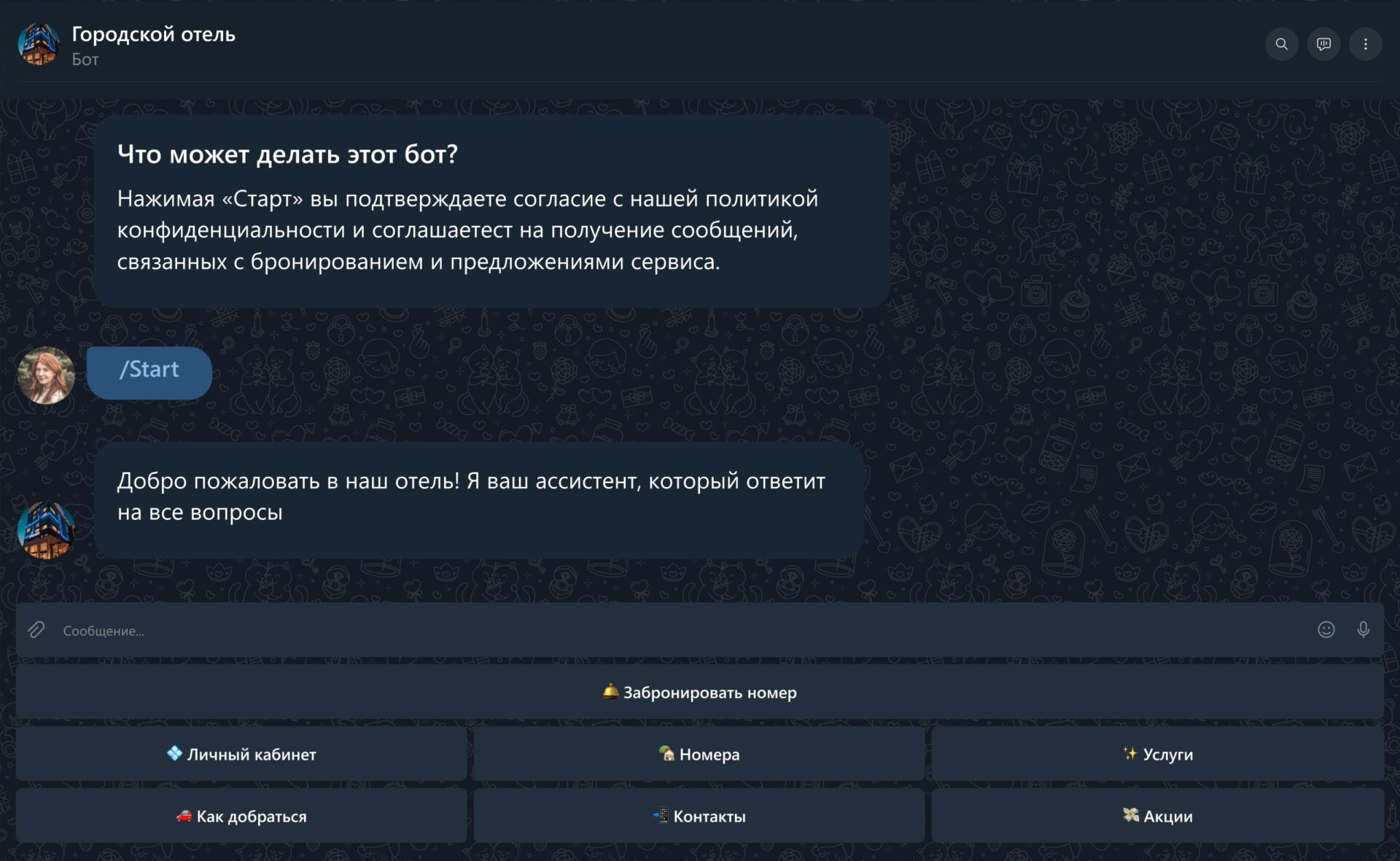 Технически бот подключается через официальные платформы мессенджеров или сервисы-агрегаторы, например, BotHelp. Отелю достаточно добавить бота в выбранный канал, прописать сценарии общения и интегрировать его с системой бронирования. После этого все диалоги идут прямо в мессенджере: гость пишет сообщение, а бот автоматически отвечает ему и ведет по заданному сценарию. Что умеет бот?