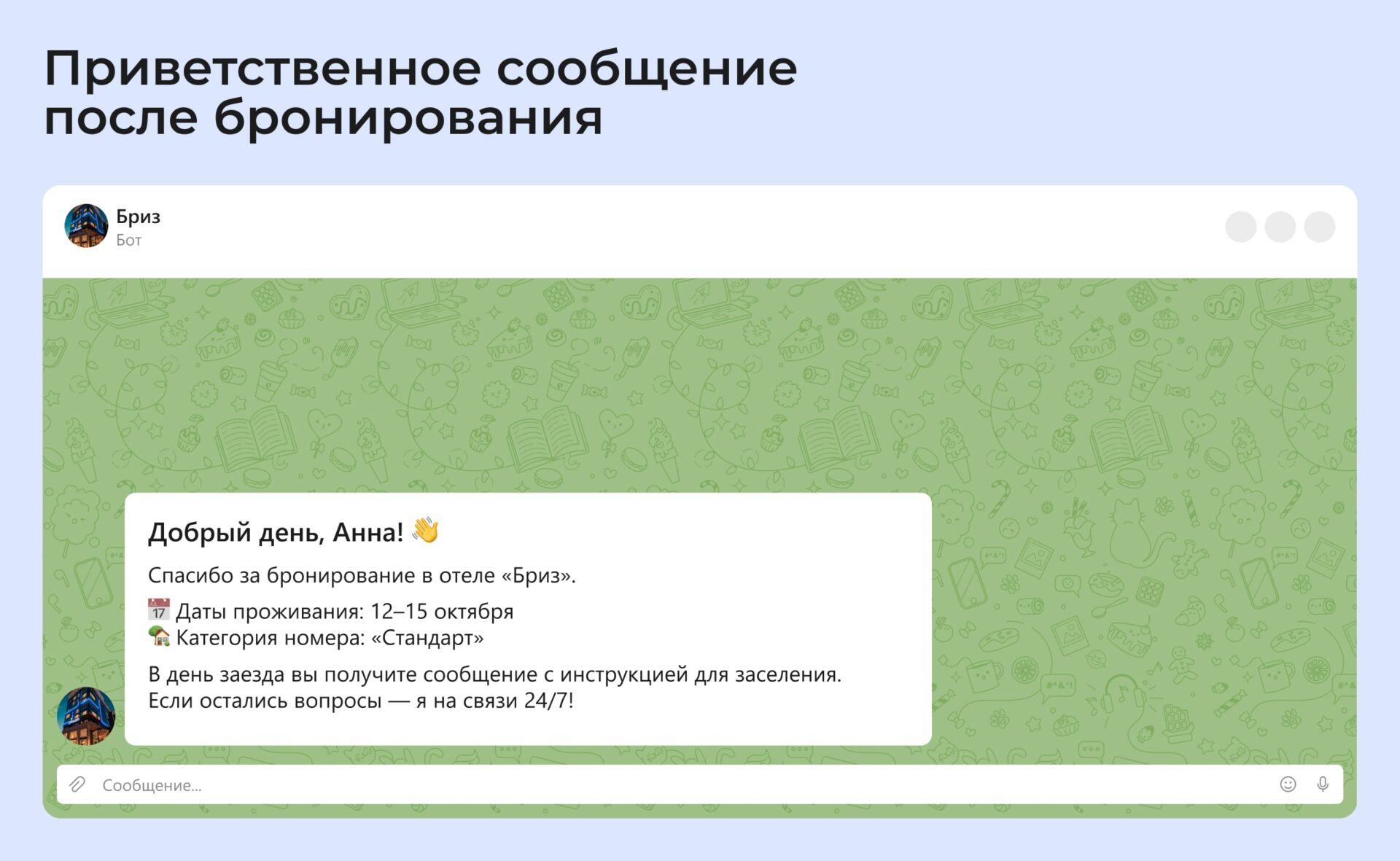 В чат-боте выстраивается целая цепочка писем, которая помогает довести гостя до заселения. Сразу после бронирования бот отправляет письмо-подтверждение заказа, за несколько дней напоминает о предоплате или уточняет детали, в день заезда присылает электронную оферту, а накануне напоминает о поездке через голосового робота. Цель такой цепочки — снизить число забытых броней и возвратов, сделать процесс заселения для гостя спокойным и предсказуемым.