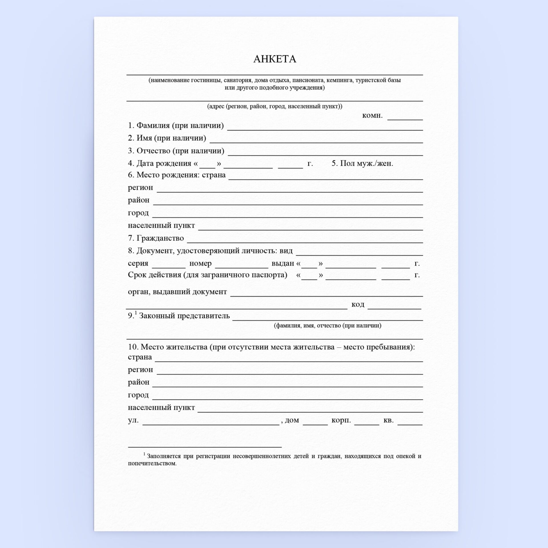 Чтобы поставить гостя на миграционный учет, сотрудник отеля должен заполнить специальную анкету в бумажном или в электронном виде. Форма анкеты установлена  Приказом МВД России от 31.12.2017 № 984. Для подачи в бумажном виде нужно заполнить ее в двух экземплярах — для МВД и для объекта размещения. Анкета должна быть заполнена на русском языке, разборчиво, от руки или с помощью технических средств. Зачеркивать, исправлять, сокращать в анкете запрещено.