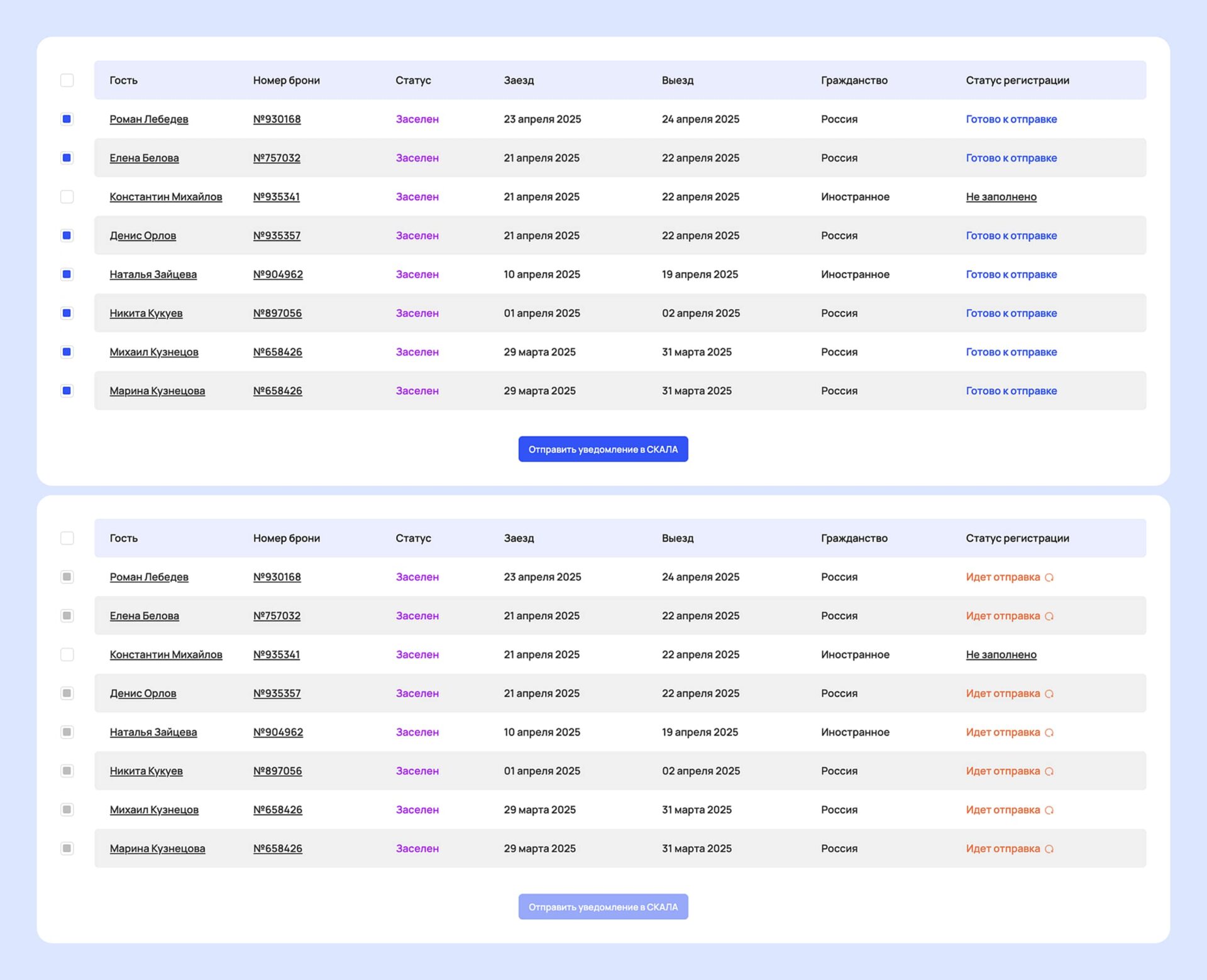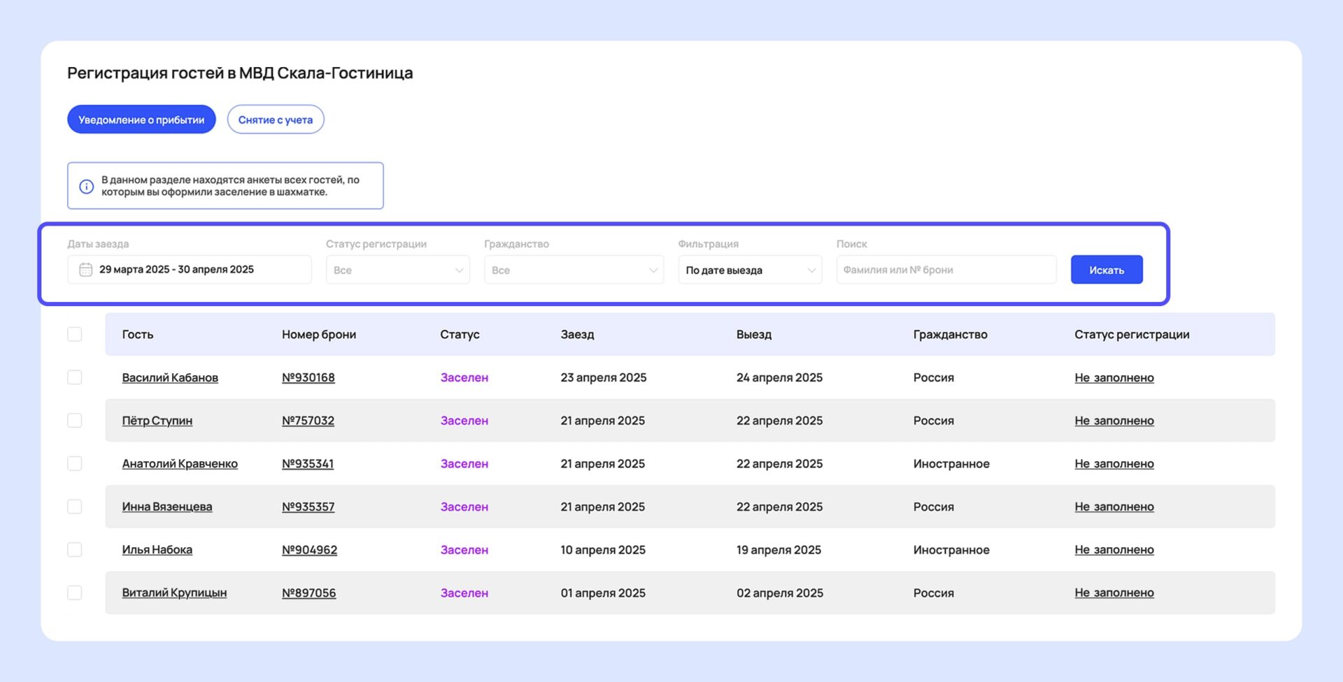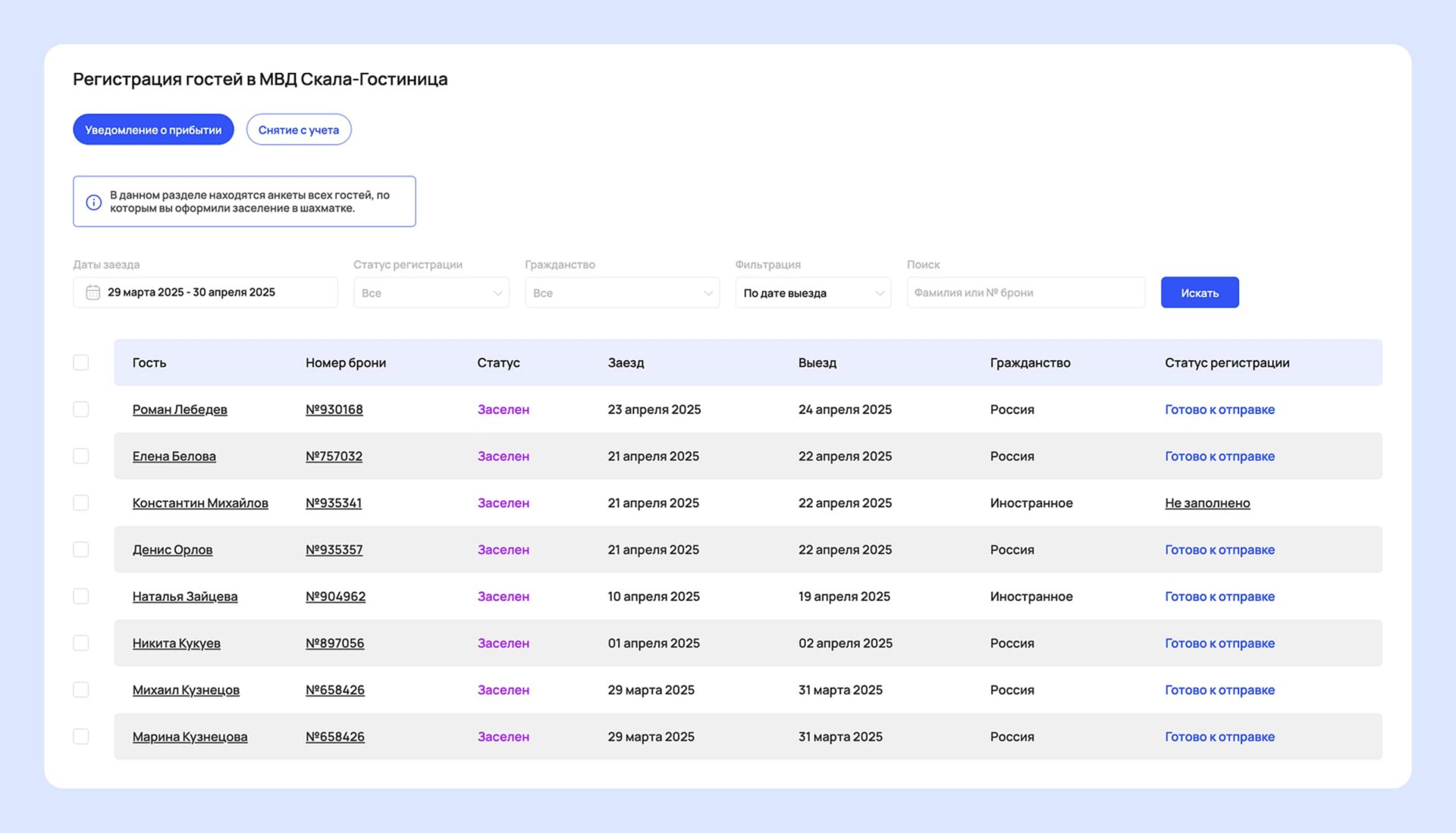 3. Контроль статусов и сроков. Система показывает, какие уведомления отправлены, какие приняты МВД, а где есть ошибка или отказ. Отель всегда видит актуальный статус и может вовремя отреагировать. Кроме того, можно видеть сроки снятия гостей с учета.